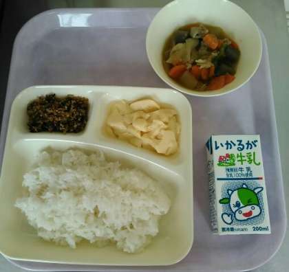 卵どうふ 豚肉とさといもの煮もの おかかなっ葉 米飯 牛乳