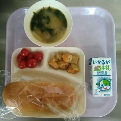 さけのマリネ 肉だんごと麦のスープ プチトマト パン パン添加物 牛乳