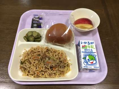 オイスターソース焼きそば きゅうりの中華あえ りんご パン パン添加物 牛乳