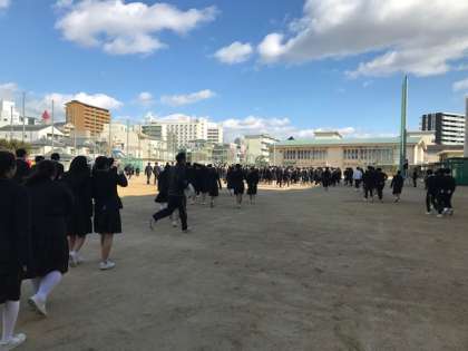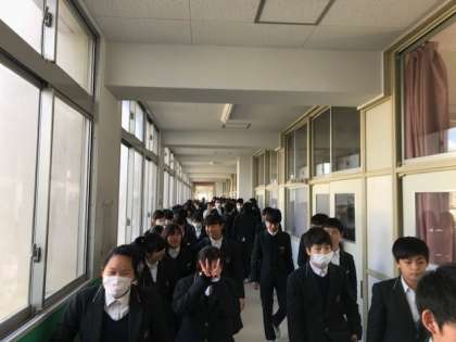 13時30分、4階第1理科室から出火を想定しての避難訓練でした。