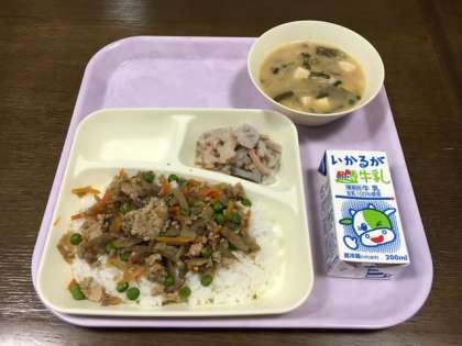 鶏ごぼうご飯 干しずいきのみそ汁 焼きれんこん 米飯 牛乳