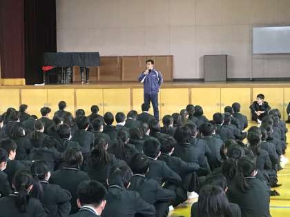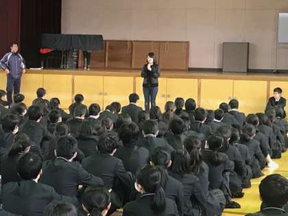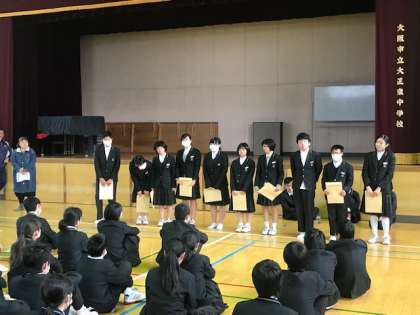 本日の学年集会は3名の先生からお話があり、児童生徒作品展に美術の授業で作成した作品「ゼンタングル」が出展される代表生徒の発表がありました。出展日は2月16日土曜から18日月曜まで、大阪市教育会館、アネックスパル法円坂にて展示されます。