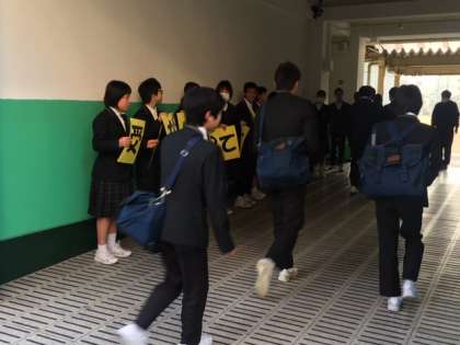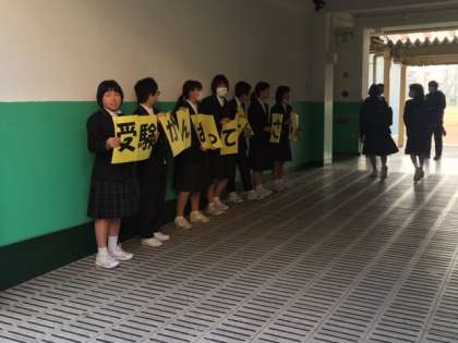 本日朝、通用門で生徒会役員の人たち(有志含む)が、明日の公立特別選抜に向けて、「受験がんばってください」というメッセージを書いた紙をもって3年生に声掛けをしてくれていました。