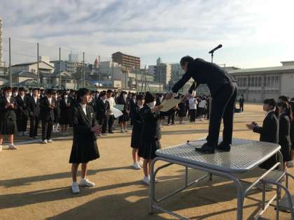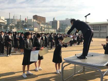 本日、全校集会で2月22日にありました「市長・教育長表彰式」にて教育長表彰された生徒の皆さんに賞状伝達がありました。