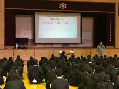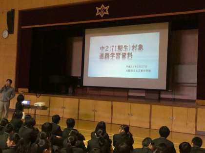 本日の1限目に、体育館にて進路指導主事の先生による、進路学習が行われました。