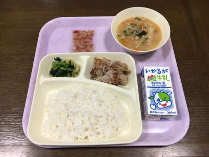 豚肉のごまだれ焼き みそ汁 こまつなのおひたし かつお節 米飯 牛乳