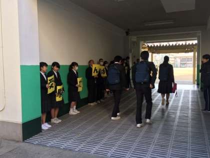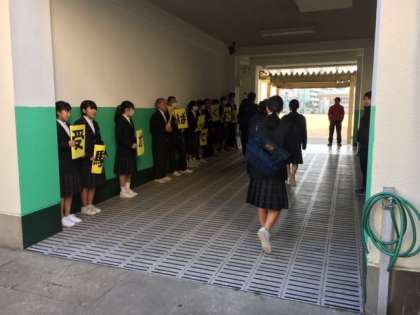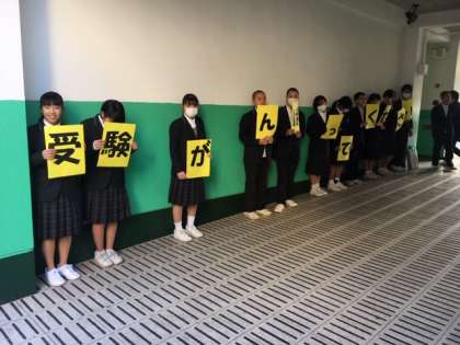 本日朝、生徒会役員を中心に有志メンバーで、3年生に向けて、11日の公立一般選抜に頑張ってもらえるように声援を送ってくれました。