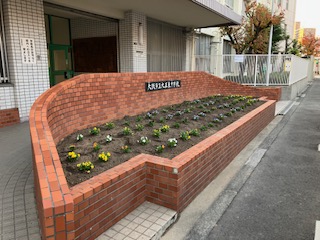 学校の正門前のお花を元気アップさんが植え替えてくださいました。彩りが添えられてきれいですね。