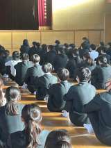 2年生、2学期の最後の学年集会には銀行の方をゲストにお迎えしました。