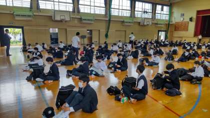 1年生は、明日から始まる一泊移住のに必要な荷物をチェックしています。