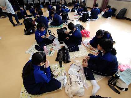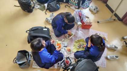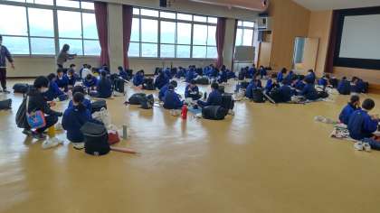 天候が雨のため、講堂で昼食を食べました。