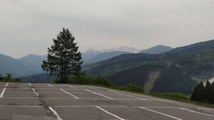ホテルから見える山の山頂には、まだ雪が積もっています。