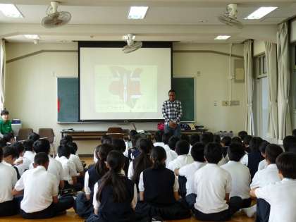 4時間目に1年生全クラスが多目的室で社会科の勉強を行いました。アフリカのケニヤからの留学生にアフリカのケニヤについて写真等を使いながら説明してもらい、その後、生徒から質問等を受けて答えてもらいました。