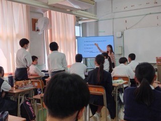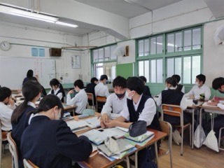 英語はネイティブの先生の前でペア発表をきています。
