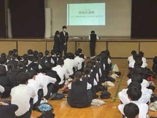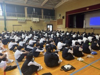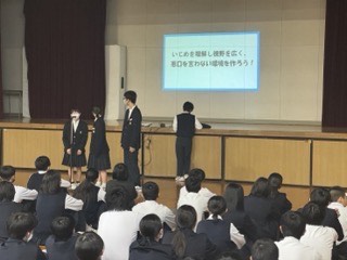 本日の全校集会では生徒会より先日行われた「いのち・いじめについて考える日」の日に策定された大正中央中学校「いじめ撲滅宣言」の発表がありました。