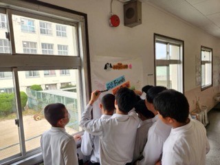 休み時間中に皆で記入しています。