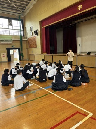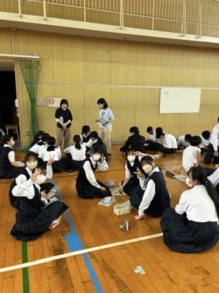 体育館で修学旅行の取り組みを各係に分かれて行っています。
