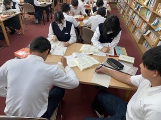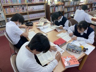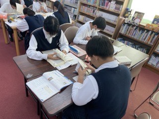 図書室で辞書を使いながら四字熟語を調べています。