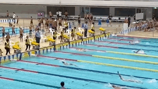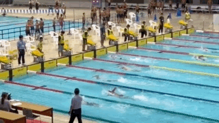 50mプールで、スタート台も高い中いつもと違う場所で頑張っています。