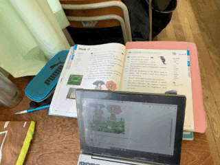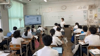 モニターを使用して、全体で教科書の内容をリピートしたり、ペアで読み合ったりする活動に取り組んでいます。