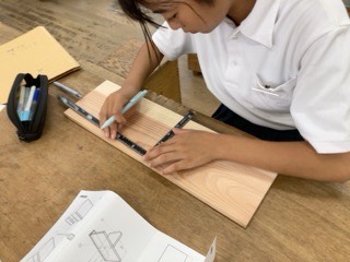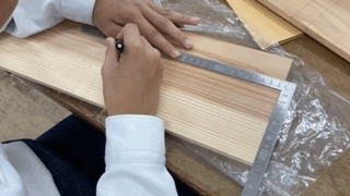 さしがね(定規のようなもの)を使用してけがき(材料に線をひくこと)を行っています。