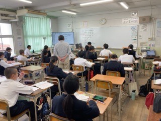 数学は、三角形の合同や錯角・対頂角・同位角を利用した角度を求める問題に取り組んでいます。