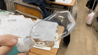 理科は、気圧と温度の関係について学習しています。ペットボトルを使用して、雲を発生させる実験をしています。