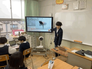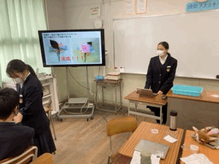 生徒会執行部のメンバーがモニターを使用して全体に説明しています。