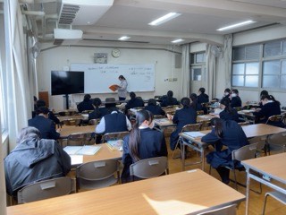 女子は、防災学習をしています。