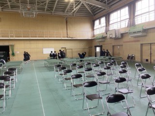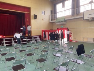 明日の卒業式の予行練習に向けて、式場設営をしてくれています。