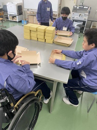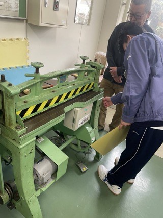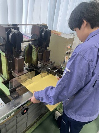 機械作業組は、機械を使って折り目をつけたり、裁断したりしています。