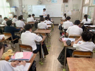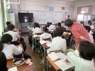 英語は、教科書の内容をワークシートを活用しながら学習しています。不規則動詞の現在形・過去形・過去分詞形についても復習しています。