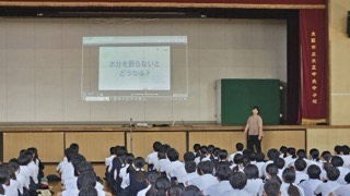生徒会からは、今月の目標について発表がありました。今月の目標は『唯一無二』。設定理由は、『自分という存在は1人しか居ないので、熱中症などの体調不良に十分に気を付けて欲しい』ということでした。