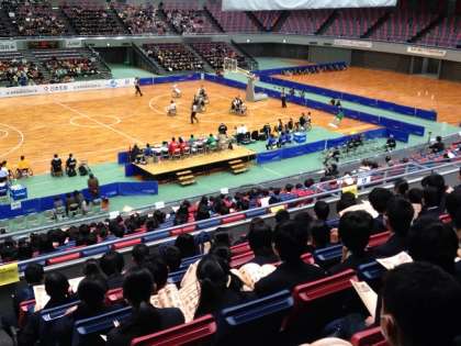 中央体育館で観戦しました。車いす同士が激しくぶつかり合いながらプレーする様子を見てとても驚いていました。初めて見る生徒が殆どでしたが、観戦態度については、しっかり食い入るように見ていました。生徒一人一人の心の中に何かが残ったことと思います。