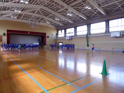 女子は、体育館で様々な競技で頑張りました。クラス対抗全員リレーを行っているところです。各自が力を発揮し全力で走っています。少し短い距離ですが、それでも差がついています。うまくバトンが中継されていたりで差がついています。