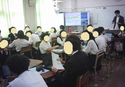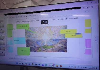 美術は、学習者用端末を活用して、鑑賞の授業を実施しています。印象に残ったことをその場で打ち込み、スライドで全体に共有しています。