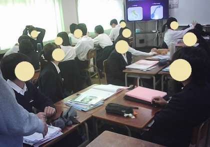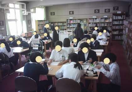 国語は、図書室で平和学習のプレゼンに向けて新聞の切り抜きをしたり、資料集めをしたりしています。