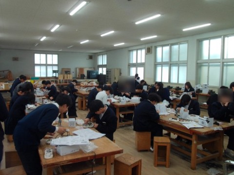 技術は、製作品に電子部品をはんだづけしています。