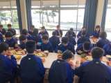 まが玉作りを終え、食事係が昼食の準備をしています。