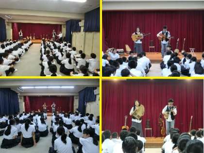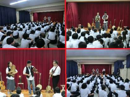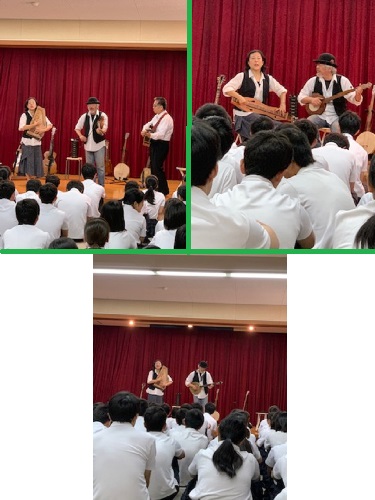 1・2時間目に1年生、3・4時間目に3年生、5・6時間目に2年生を対象に多目的室で生演奏をしていただきました。放課後には楽器に触れる時間を設け、多くの生徒が集まってきました。