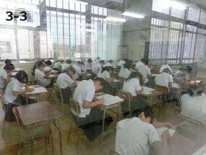 生徒の真剣な受験のようすに、物音を立てられない雰囲気です。窓や扉の閉まっている教室では、窓越しの撮影となりました。生徒たちのようすをご覧ください。