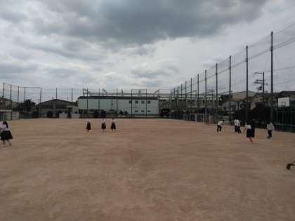 写真上:本日よりソーシャルディスの確保も目的に昼休みの運動場を開放しています。