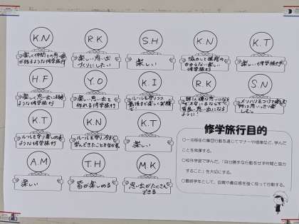 教室前の廊下には修学旅行での各自の目標も貼られています。