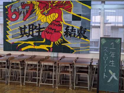 1年生は給食で利用するストローをリサイクルして1枚の「学年応援旗」を作成しました。