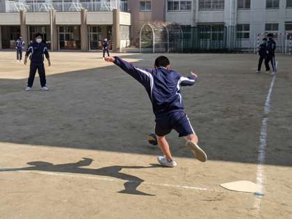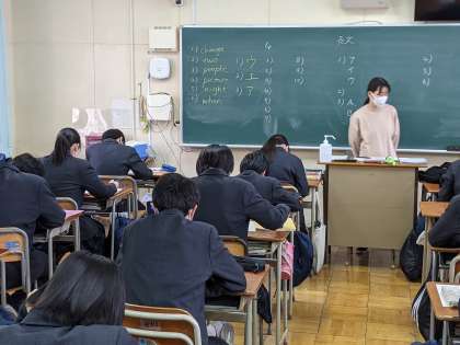 3年生が教室では私立高校の入試に向けた対策問題(英語)と運動場では男子生徒が保健体育でキックベースに汗を流していました。