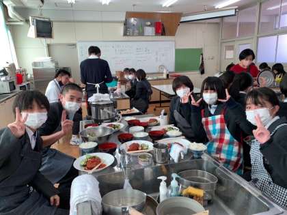 コロナウイルス感染拡大により長い間実施することができなかった調理実習ですが、感染予防を十分行い、意識しながら班で協力し、完成までみんなで頑張っていました。手間暇かけて自分たちで作った料理はとてもおいしかったようです。