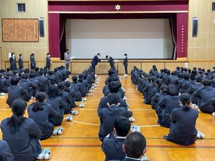 朝の全校集会で野球部の表彰がありました。