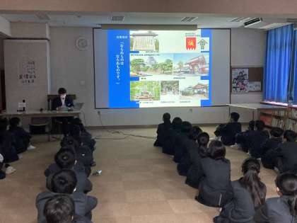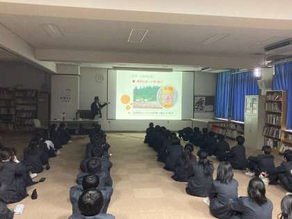 2月10日(金)の6限目に本校図書室で、福島県より講師の先生をお迎えして、1年防災教育を実施しました。生徒の皆さんは講師の先生のお話を熱心に聞いていました。