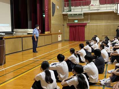 本日(7月20日)1限目に体育館で、大正警察交通安全課より講師の先生をお迎えして、生活指導講話「交通安全について」を実施しました。