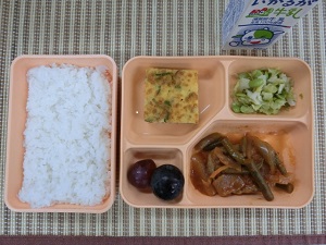 ☆「煮こみハンバーグ」は、色づくまで炒めたたまねぎとにんじん、三度豆を砂糖、塩、ケチャップ、ウスターソースで味付けしたソースの中で煮こんでいます。